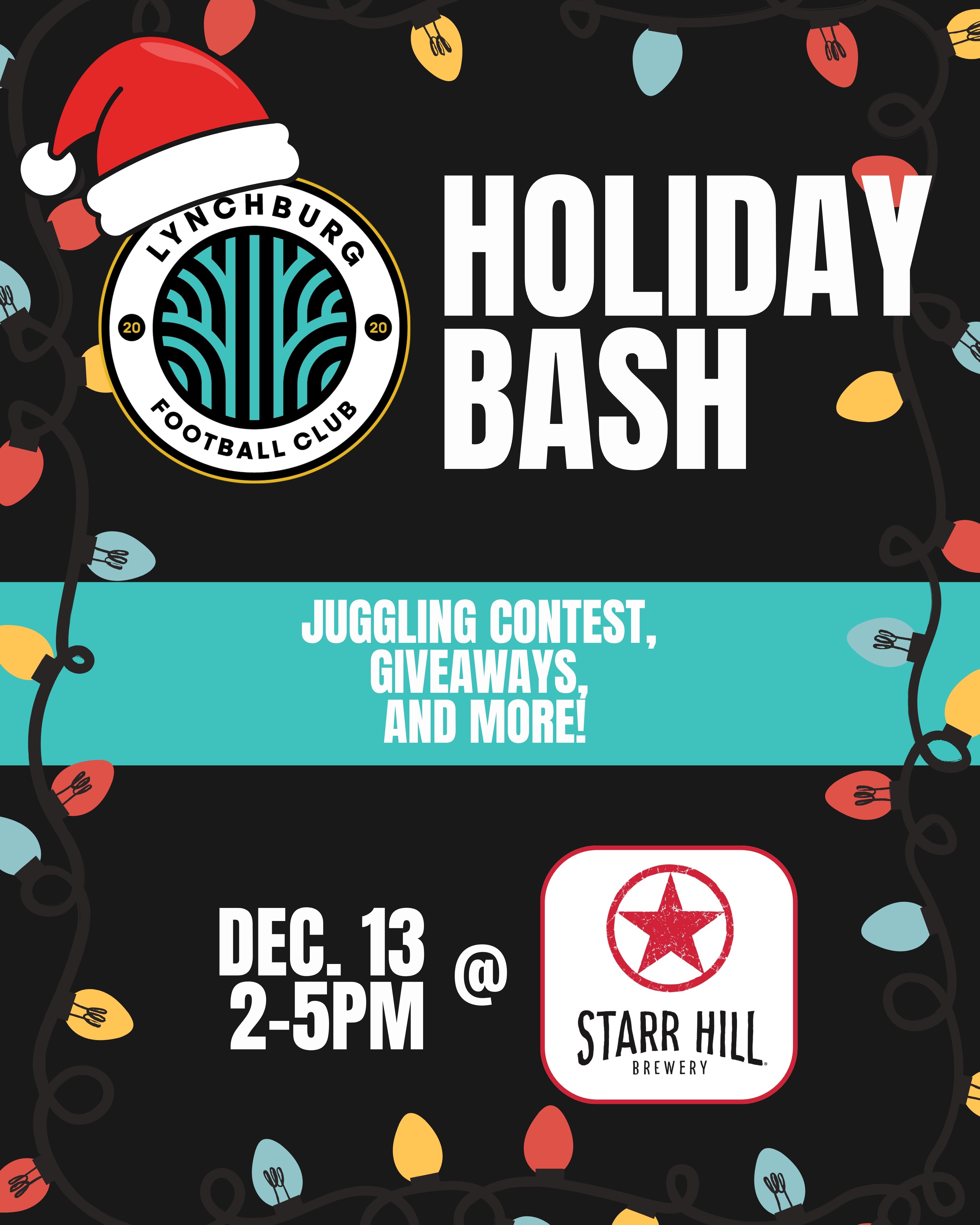 Join us in December for our Holiday Bash! Come get to know the players, coaches and the rest of the Lynchburg FC organization! We'll have the Arsenal/Wolves game on, juggling contests and other giveaways. Contests and giveaways will be open to all ages!