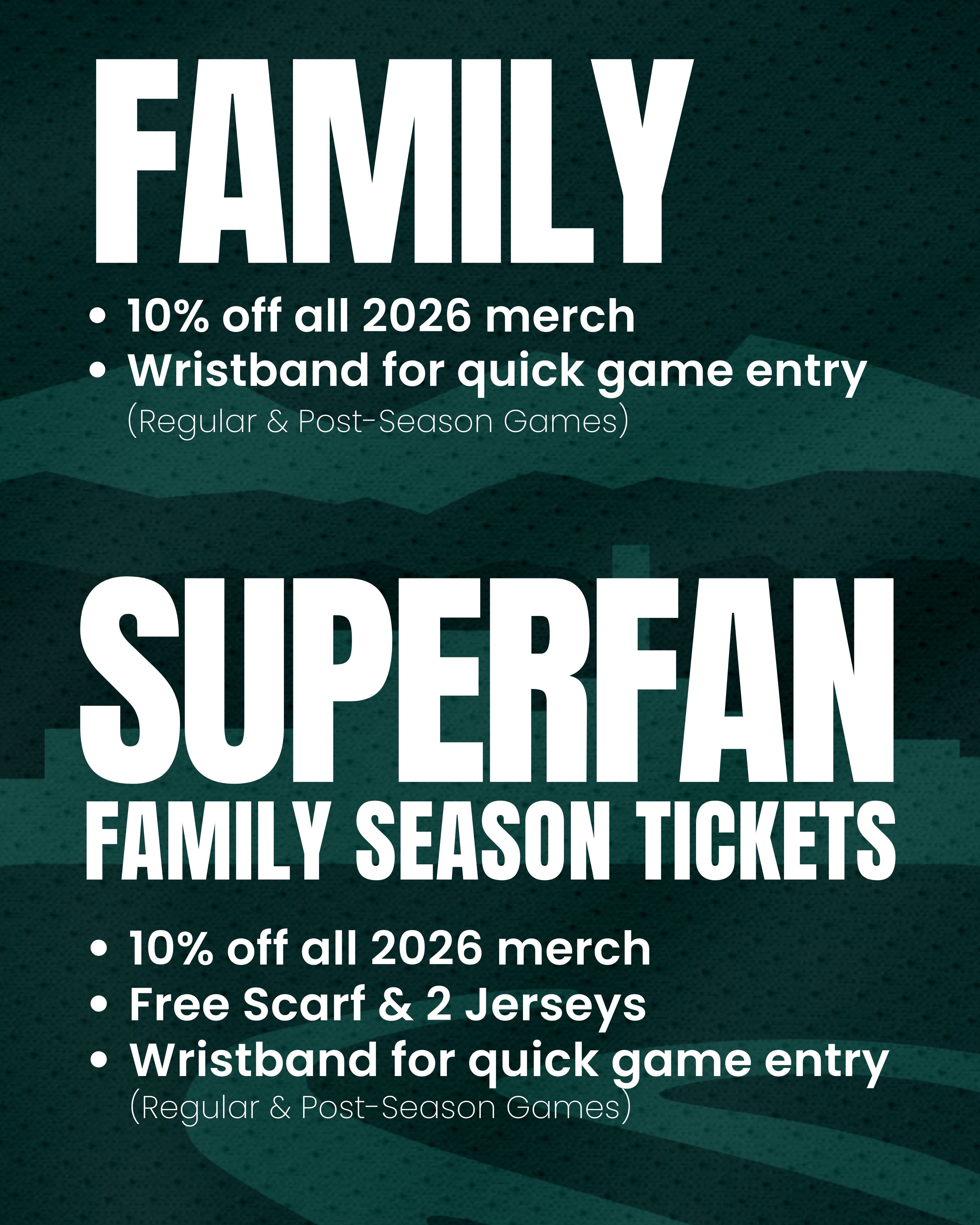 Season Tickets Package is $150. Benefits include 10% of all 2026 Gear, Scarf, 2 Jerseys (#26) and Wristbands for Quick Entry to all games. (Regular Season & Playoffs) *Families must live at same address**Click "Season Tickets" tab for jersey and scarf options**Value of over $305*
